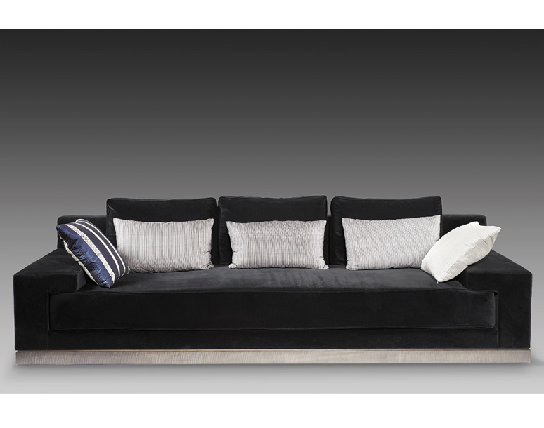 Sofa upholstered with leather or fabric with three lower-back cushions and two decorative cushions.