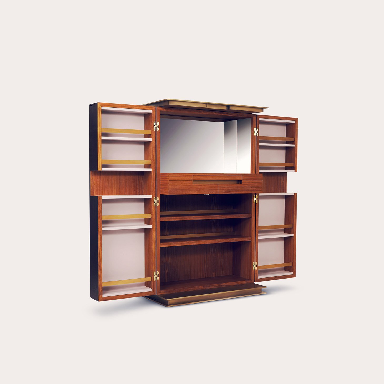 Evocative of the Italian city most famous for its central role in maritime trade over centuries, this gloriously elegant and refined piece elevates cabinets to the pinnacle of luxury. A master of mixing materials, textures, and reflection, Bruno Moinard Editions used an oiled Assamela wood with leather-lined shelves for the interior, and finished it with a hand-painted exterior lacquered with brass-plated steel. Go beyond simply storage with sensual luxury of the Genoa.