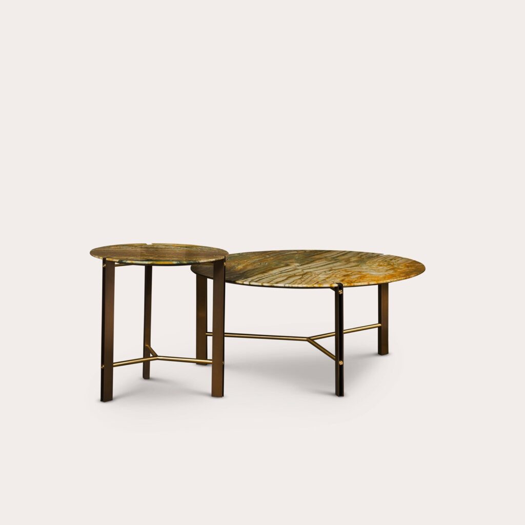 The TUNIS coffee table, by Bruno Moinard, reflects the designer’s love for expertly combining disparate materials and finishes into uncanny and harmonious pieces. The elegant varnished brass legs support a round tabletop in Pocahodas marble. The clarity and refined strength of these tables makes them impervious to trends, a remarkable and balanced fit in almost any room.