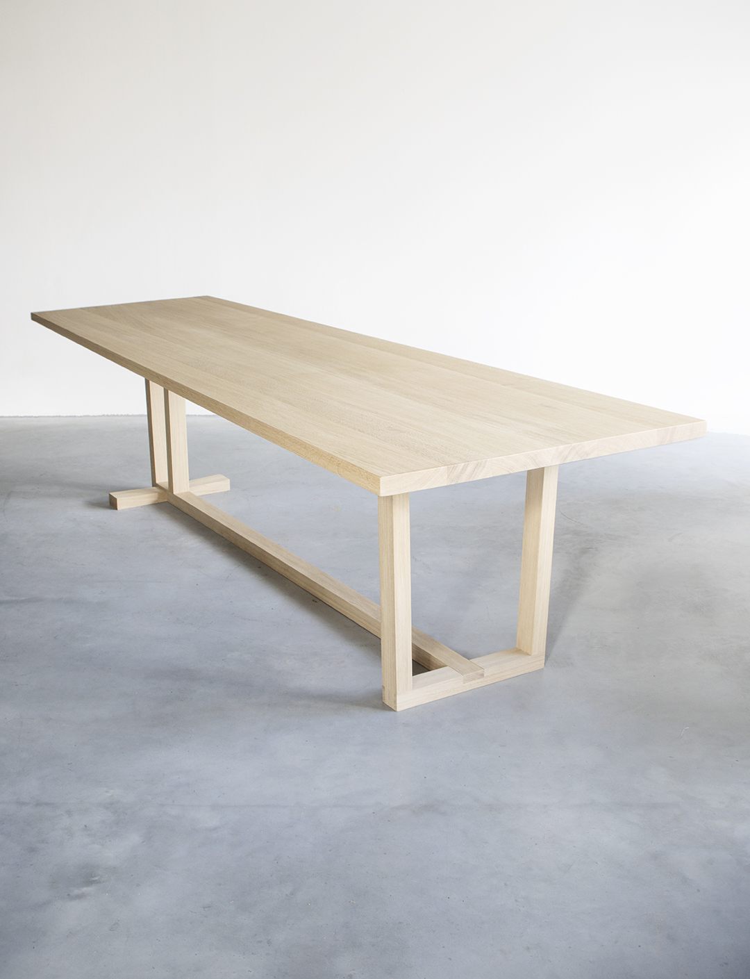 This table is unique in its cleanliness, in its naked perfection. Although the WEDGE seems kind of light and floaty, there is some heavy craftmanship in it. Eighth degree angles characterize the design and can be discovered in unexpected places, not only in the wedge-shaped legs. The top runs from a thick center to thinner sides and widens from the back to the front (or vice versa)